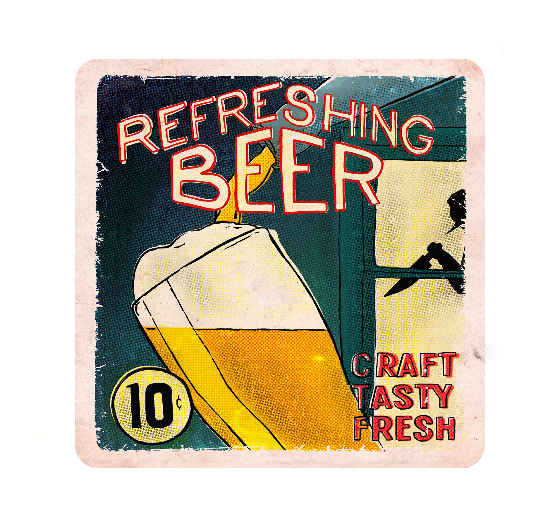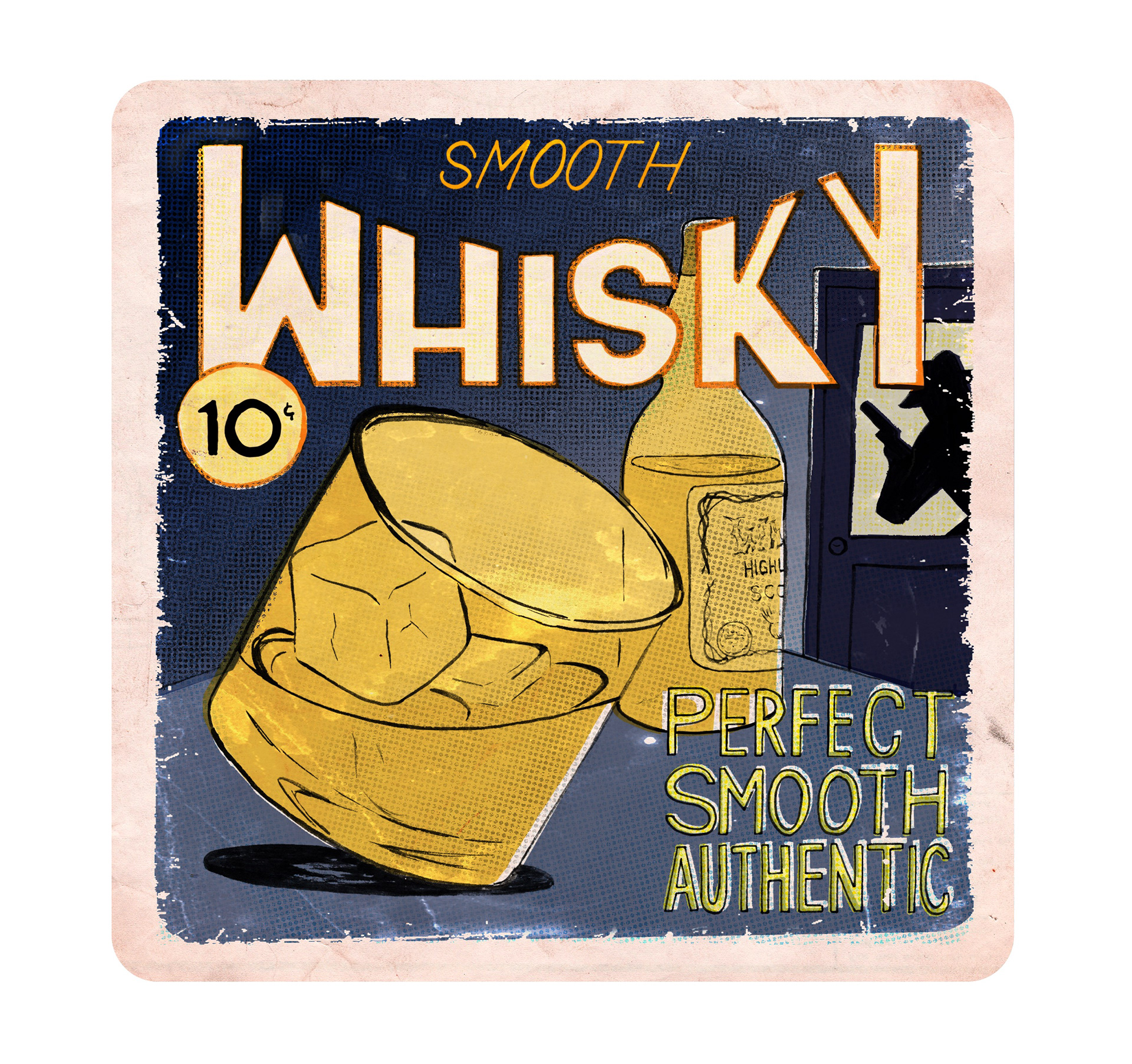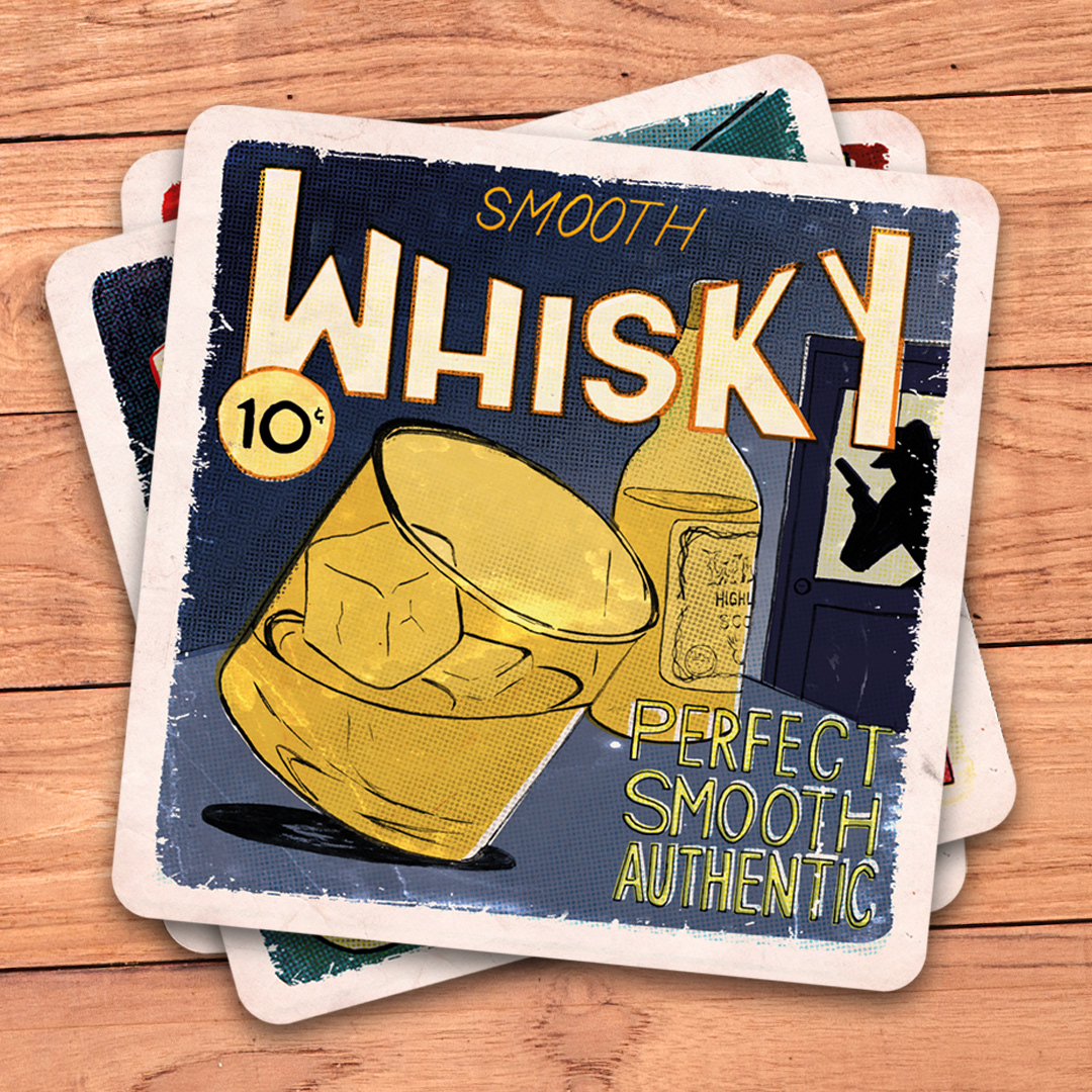 A set of 3 coasters inspired by detective and thriller pulp magazines covers.
