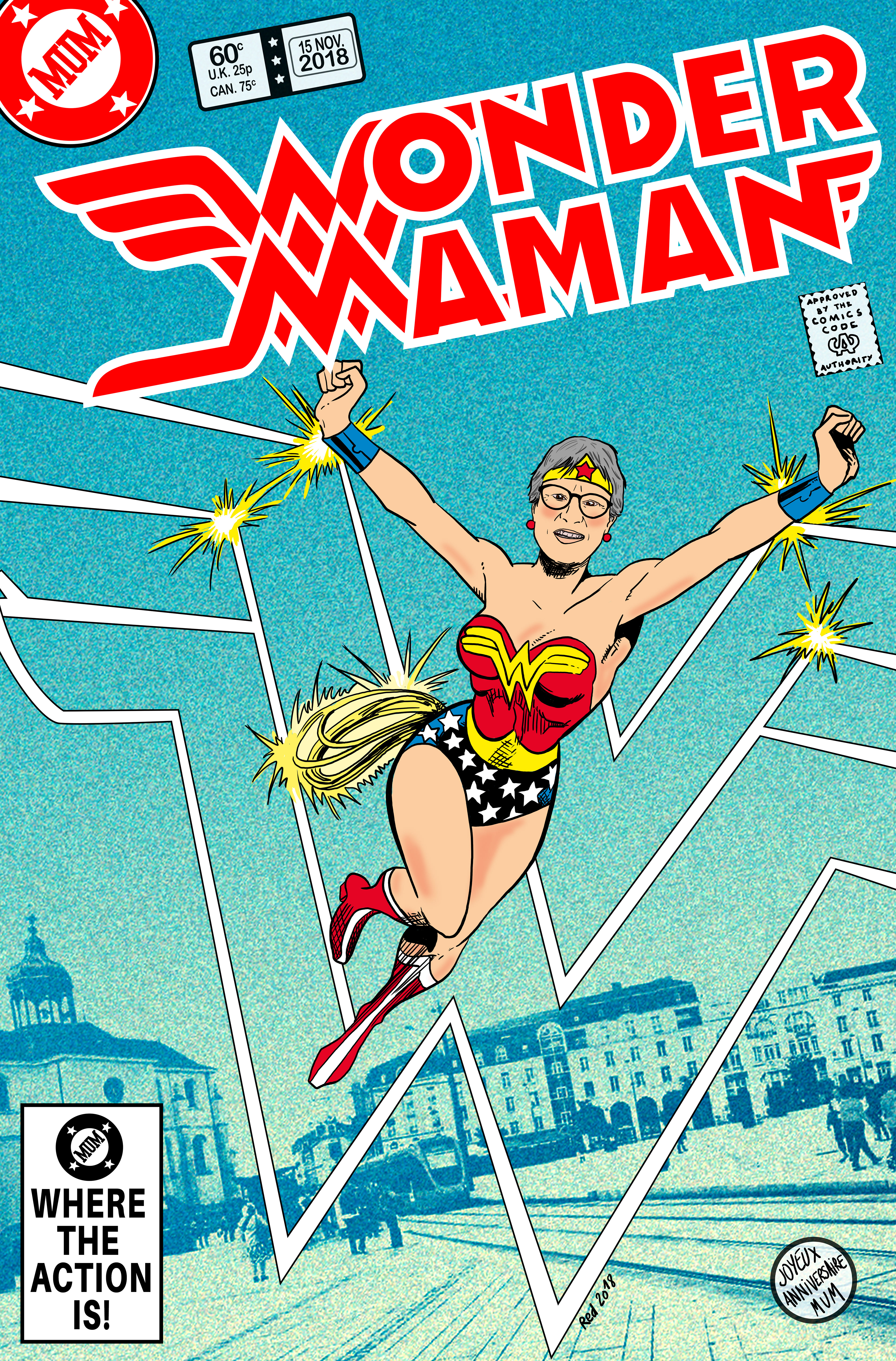 A comic book cover of the famous superhero "WonderMaman" (aka "WonderMum") !